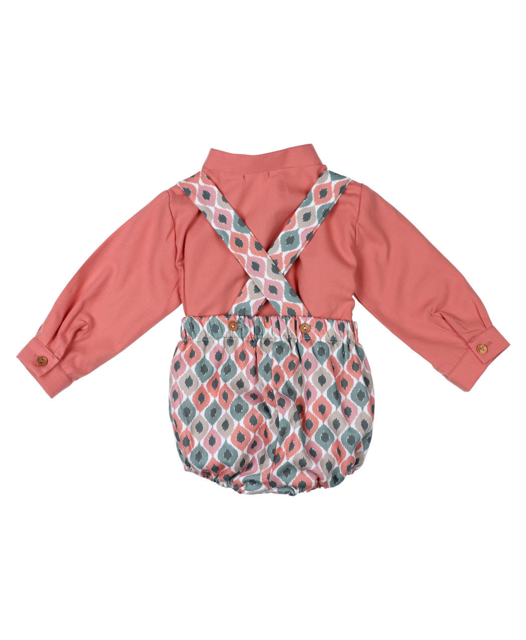 Conjunto 2 piezas para bebé niño. Camisa cuello mao en color arcilla y ranita con tirantes en estampado étnico de Popys.