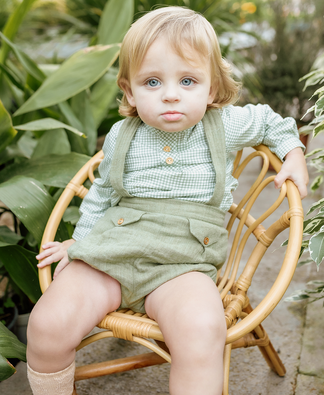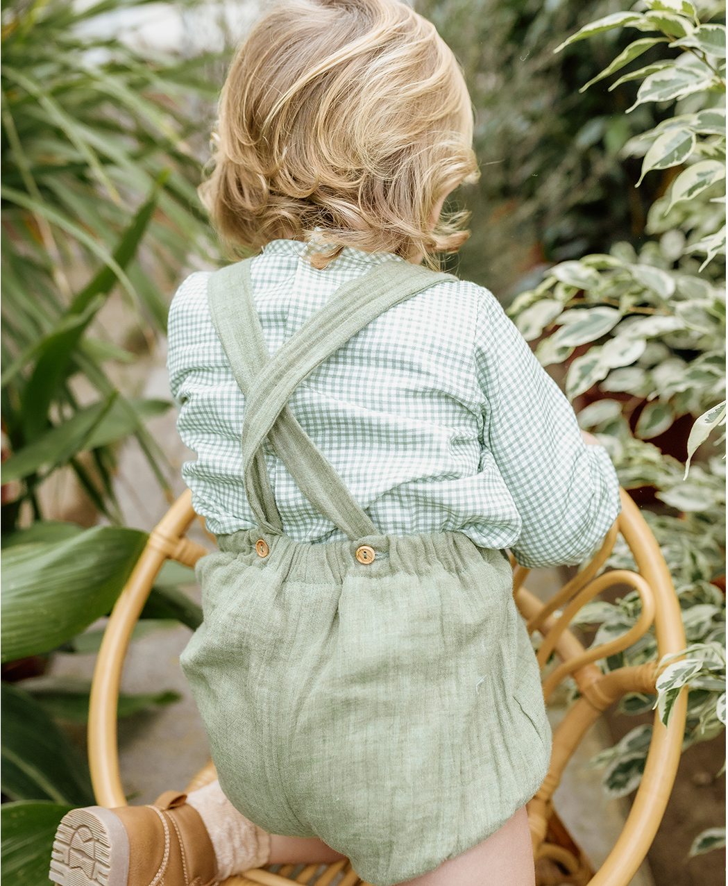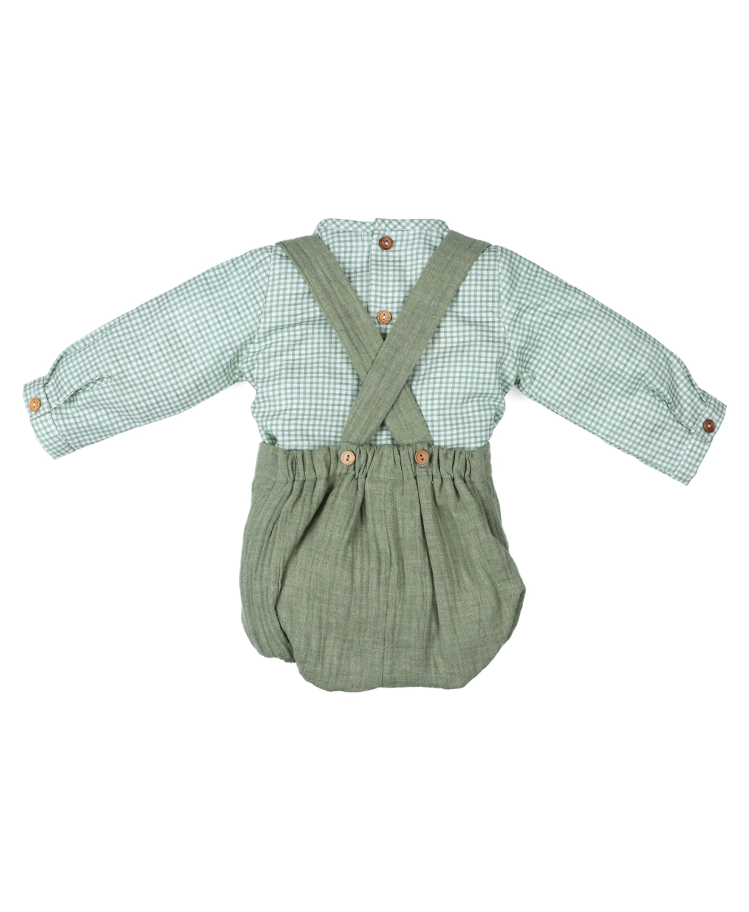 Conjunto para bebe niño 2 piezas. Camisa manga larga en cuadros blanco y verde y ranita con tirantes verde a juego. Colección otoño / invierno 2025/2026 de Popys.