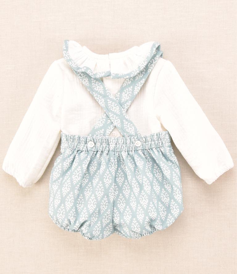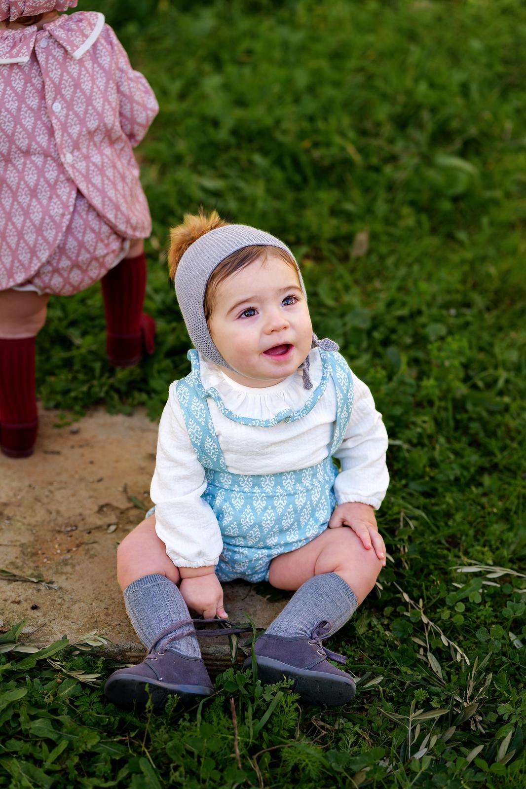 Conjunto 2 piezas para bebe niño. Blusa cuello bebe en bambula blanca y pololo con tirantes en tejido estampado turquesa. Colección otoño – invierno 2025/2026 de la marca española José Varón.