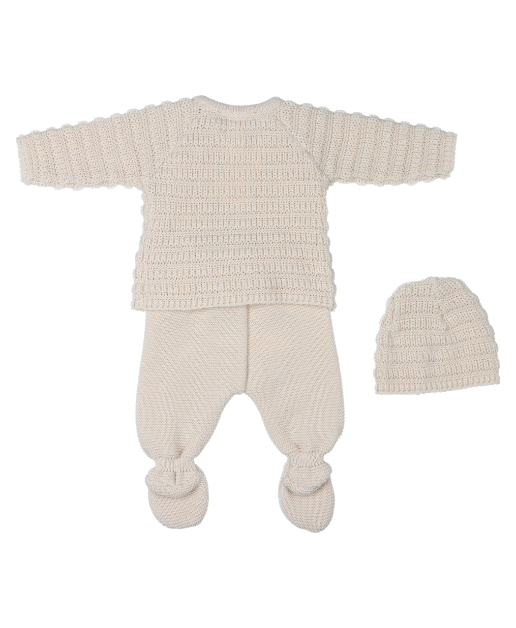 Conjunto 3 piezas canastilla bebé. Jersey, polainas y gorrito en color vainilla. Colección otoño – invierno 2025/2026 de la marca española Popys.