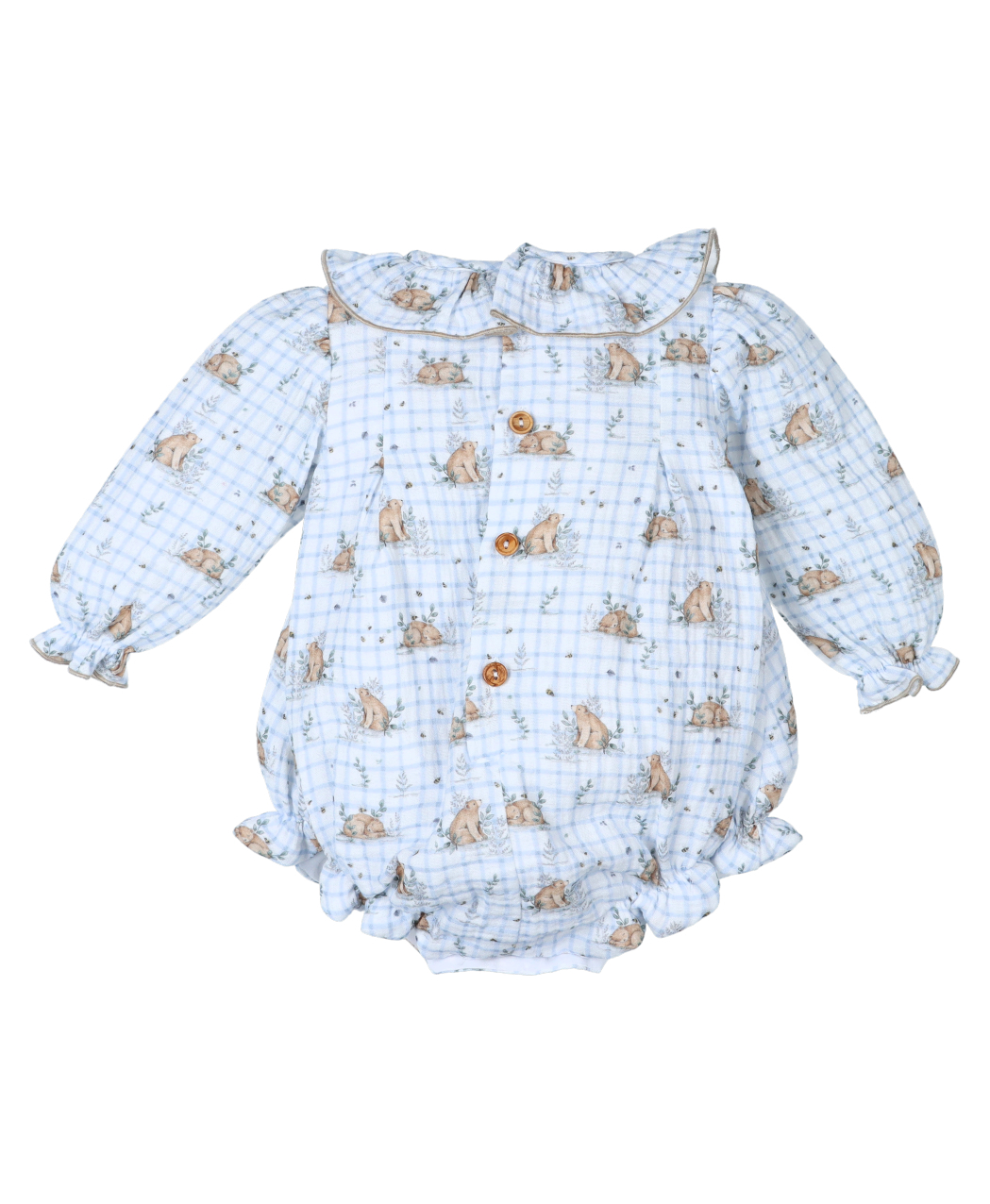 Pelele para bebe en tejido estampado de ositos. Colección otoño – invierno 2025/2026 de la marca infantil española Popys.