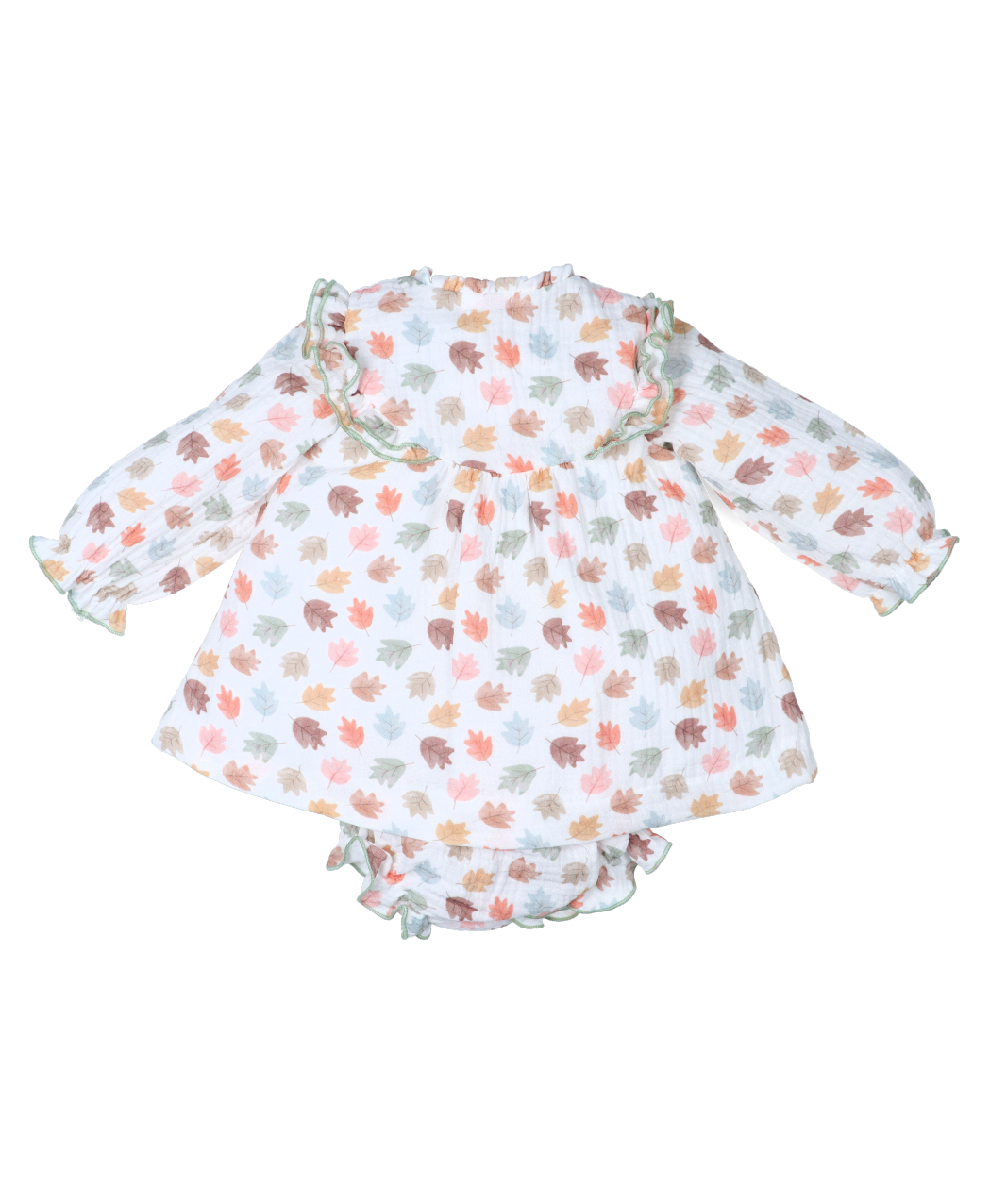 Jesusito para bebe niña en bambula estampada con motivo de hojas. Colección otoño – invierno 2025 / 2026 de la marca española Popys.