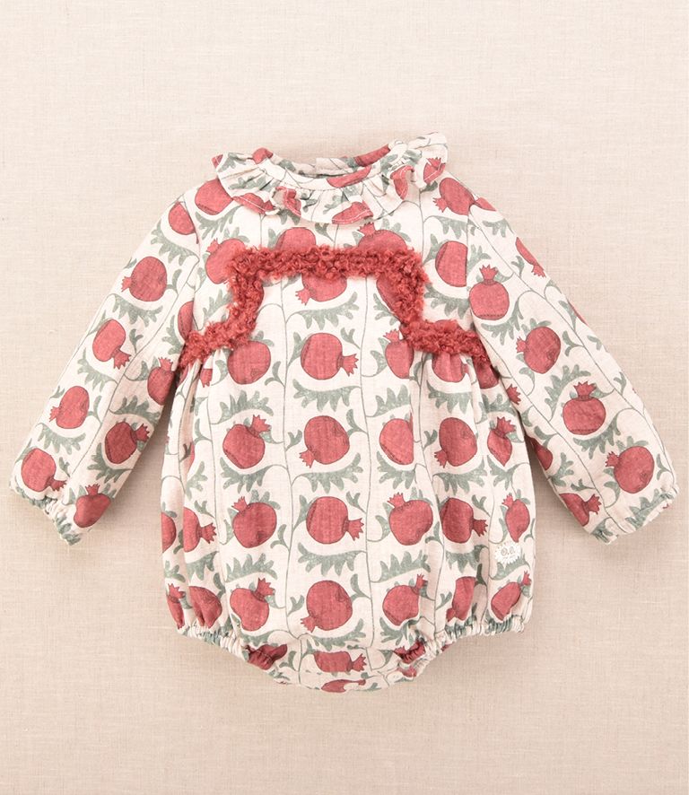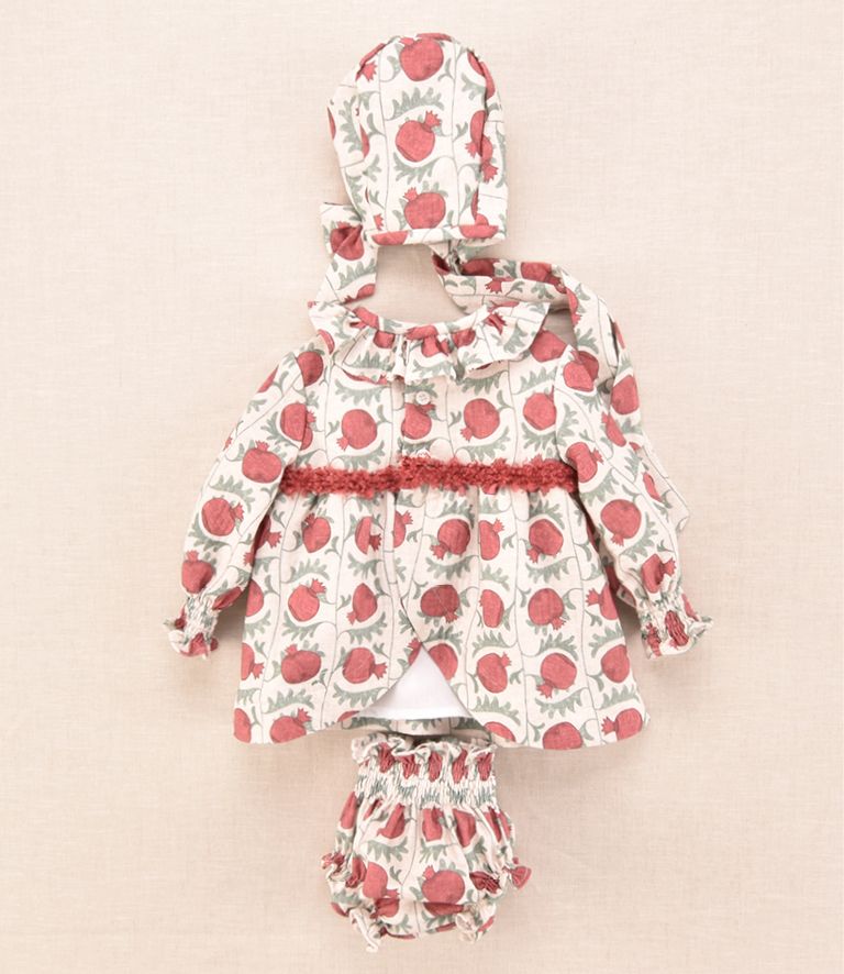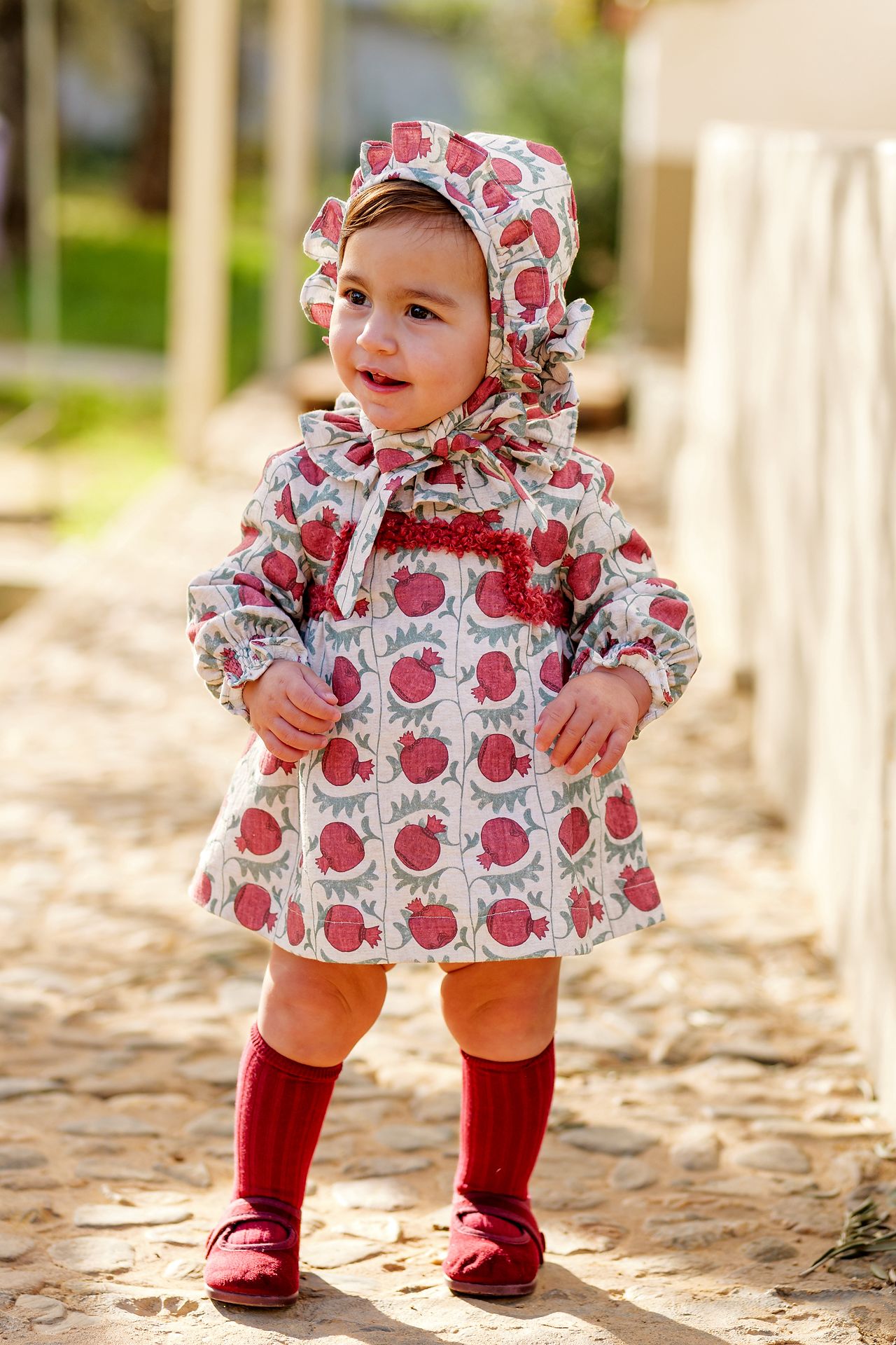 Vestido para bebe niña con capota y cubrepañal en tejido estampado de granadas. Colección otoño – invierno 2025/2026 de la marca española José Varón.