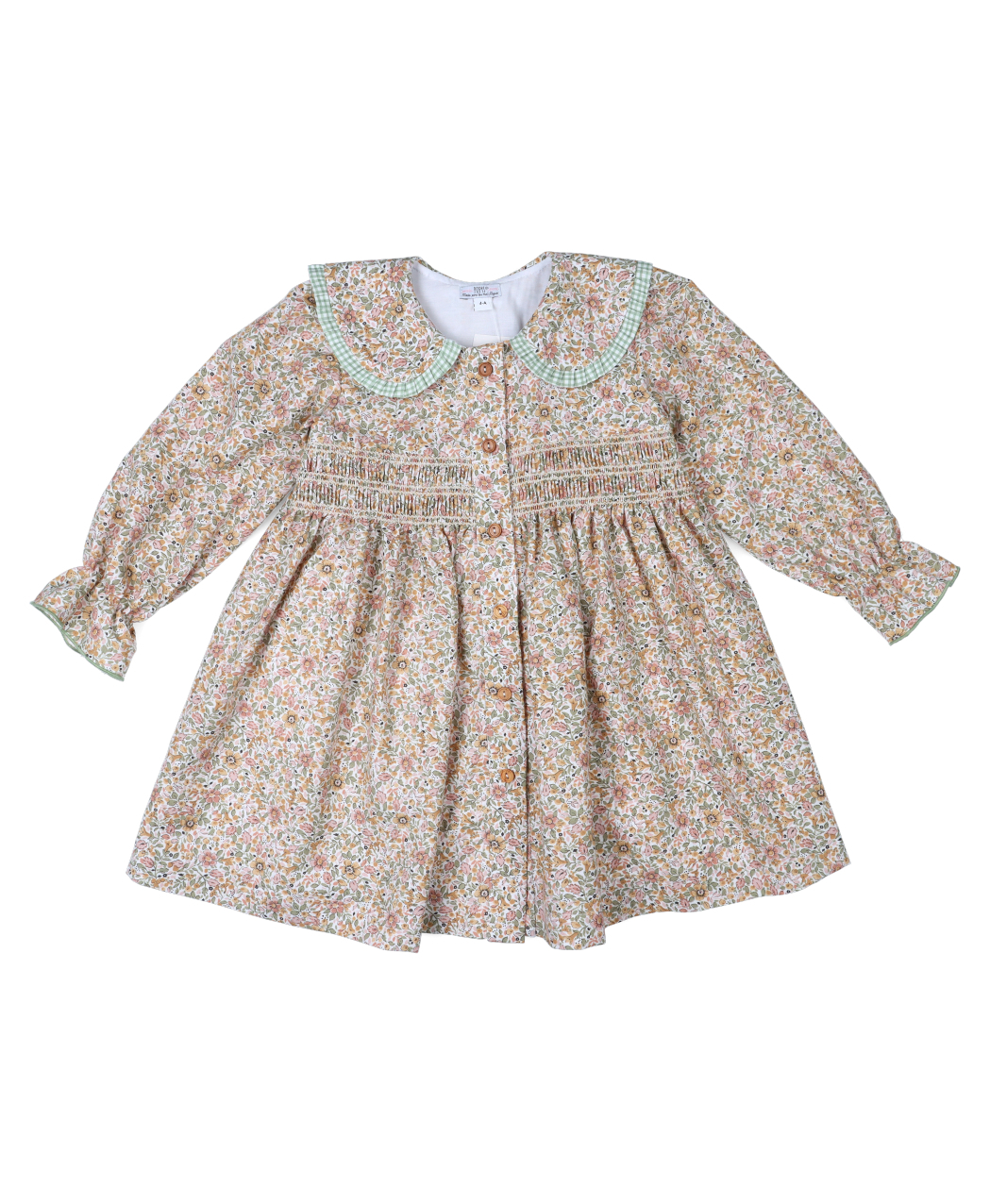 Vestido infantil para niña en tejido liberty con cuello volante y botones de madera. Colección otoño – invierno 2025 /2026 de la marca española Popys.
