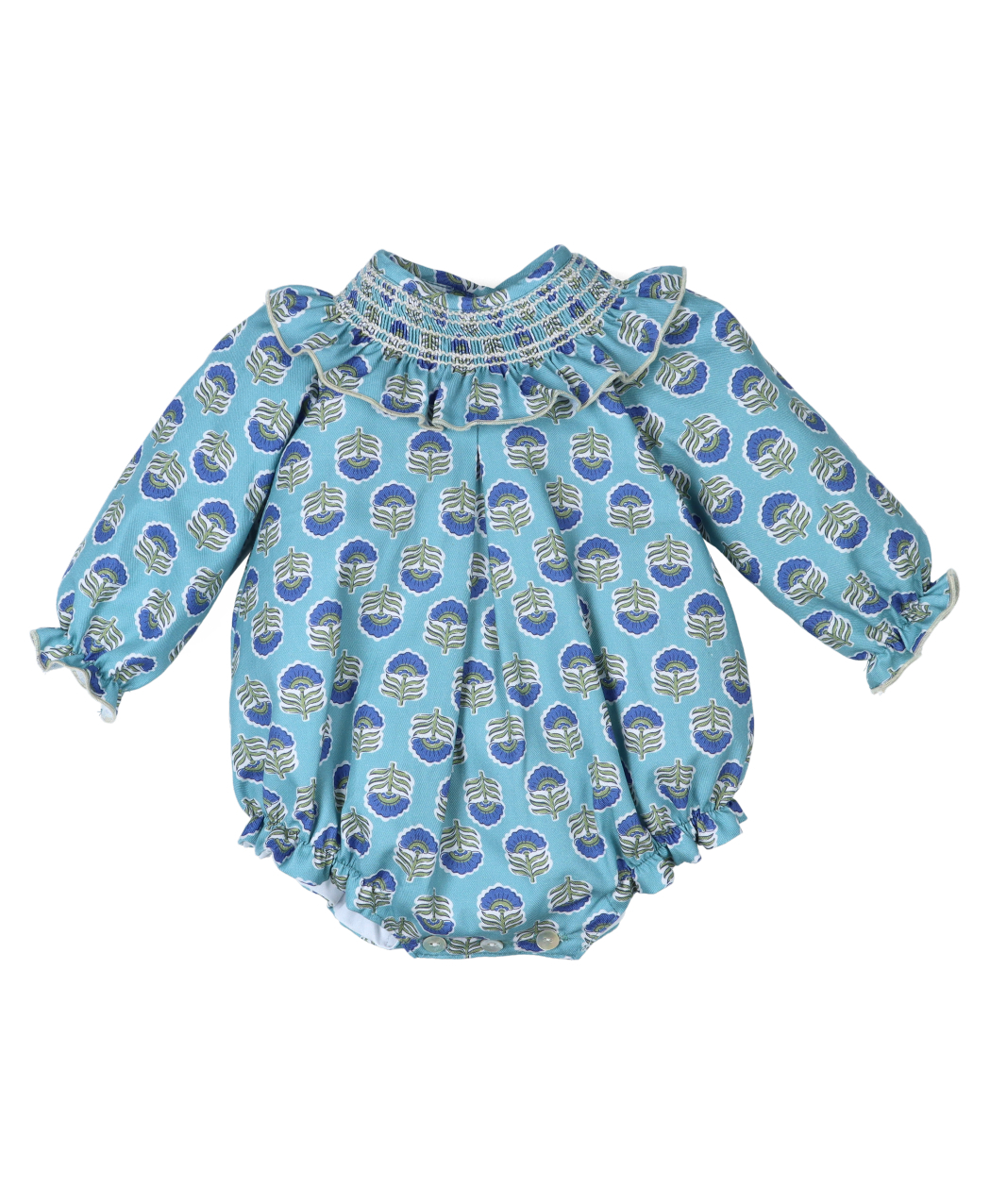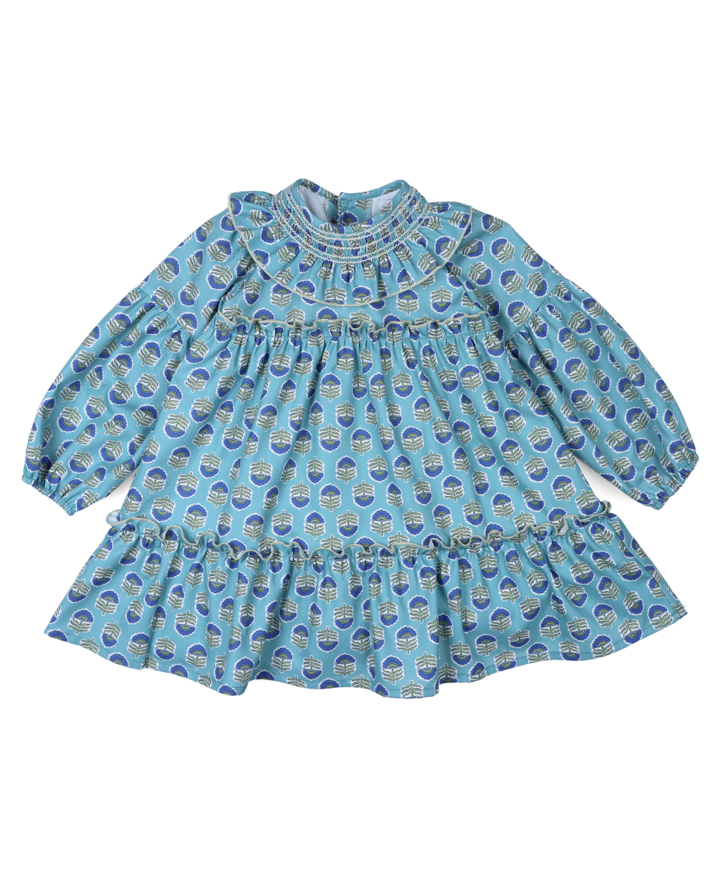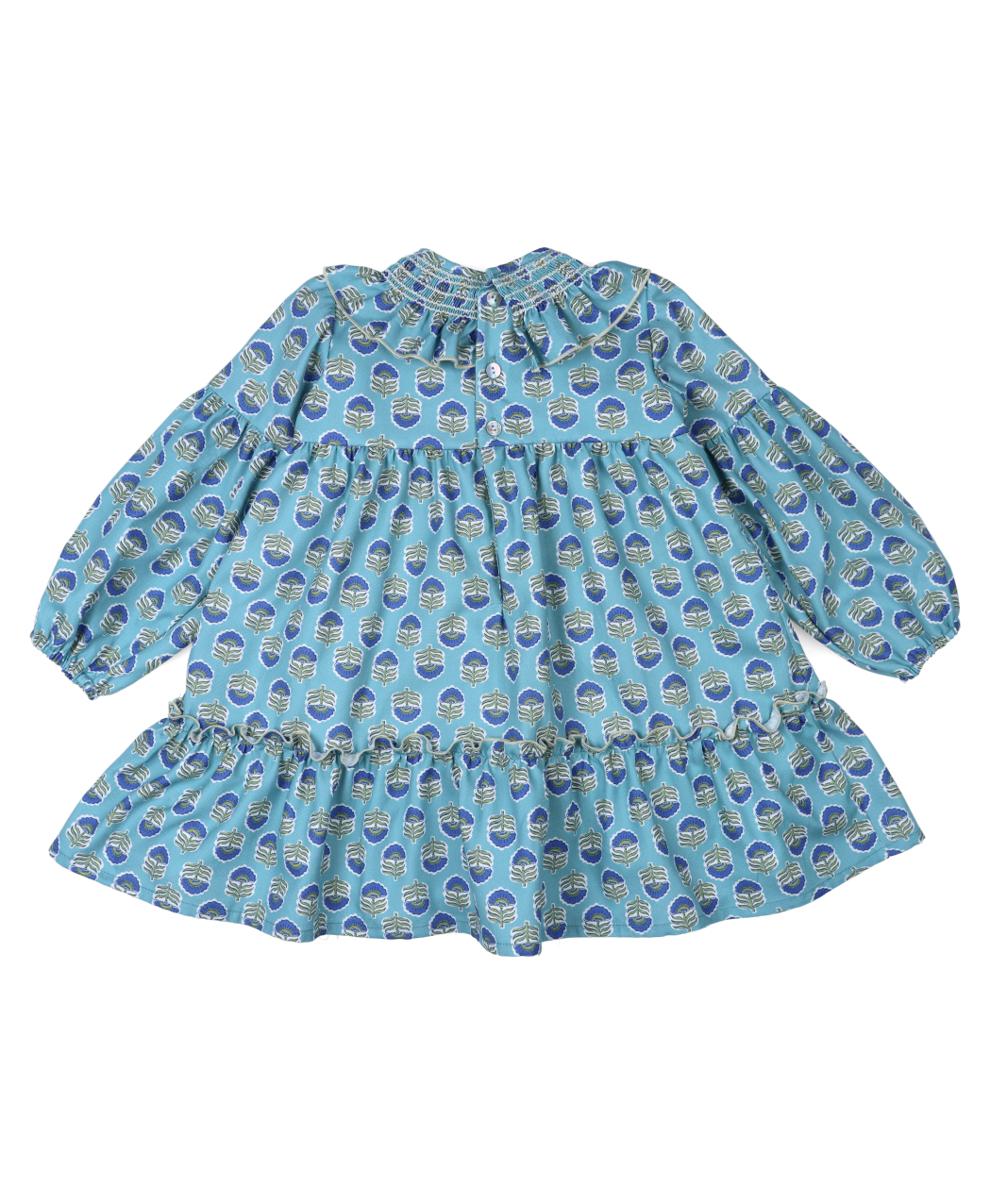 Vestido infantil para niña en tejido estampado en tonos azules. Colección otoño / invierno 2025/2026 de la marca infantil española Popys.