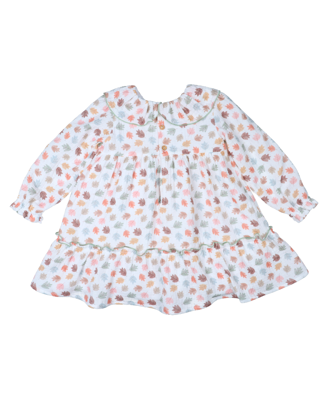 Vestido infantil para niña en tejido de bambula con estampado de hojas. Colección otoño – invierno 2025 / 2026 de la marca española Popys.